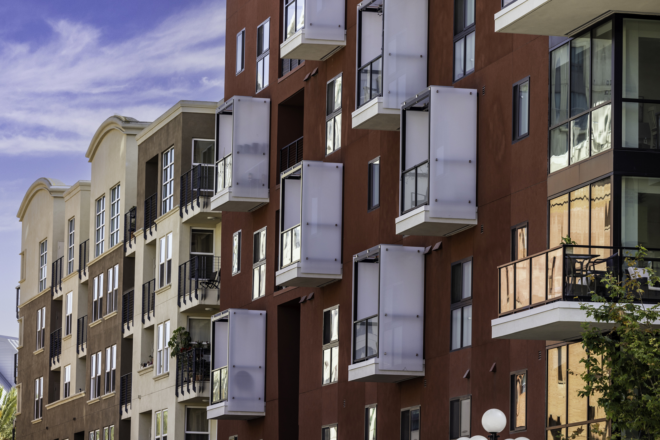 A multi-family building with balconies on its side.